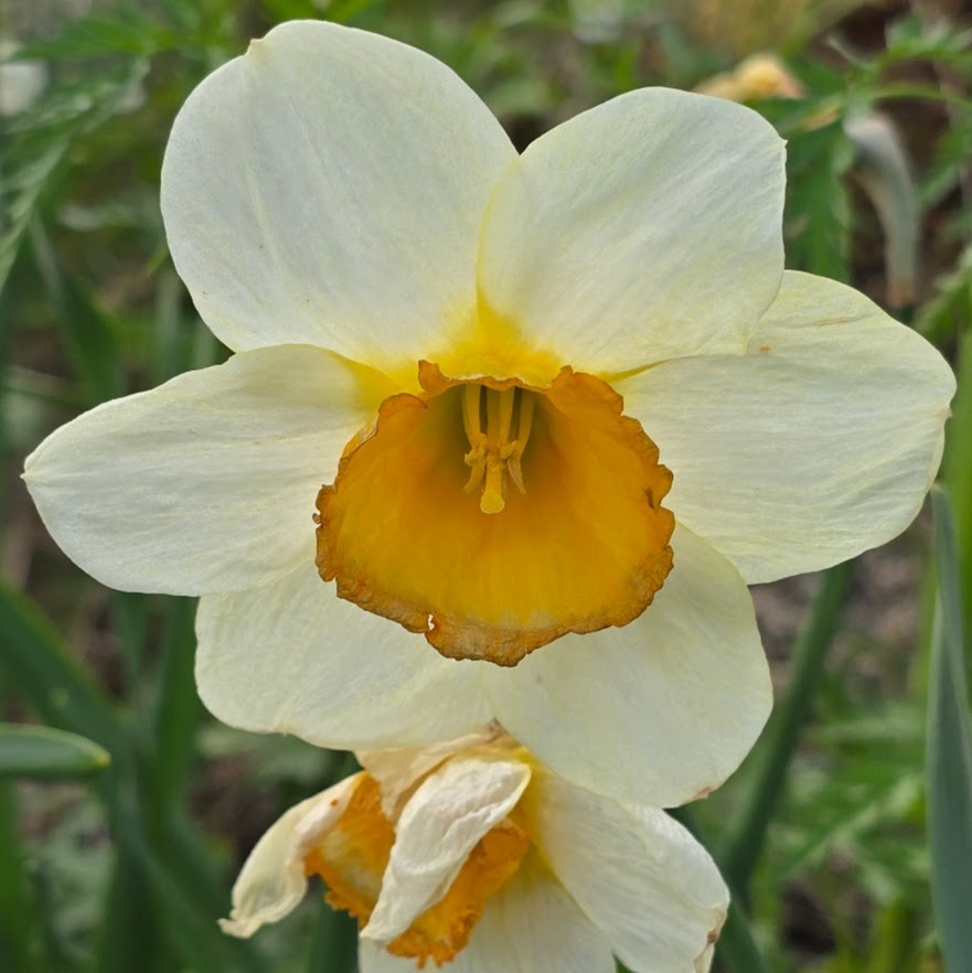Keskivarhainen Sebre Avanti kukkii haaleankeltaisilla trälehdillä ja oranssin värisellä puolipitkällä torvella.