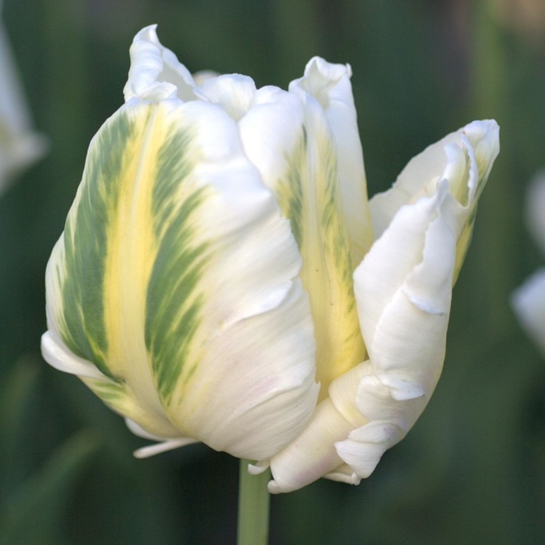 Tämä valkoisen vihreä tulppaani paraatipaikalle. Hieman varjossa väri vielä korostuu. Papukaijatulppaanit ovat näyttäviä pieninäkin ryhminä. Ne ovat tulppaanien karkkeja, joilla halutaan tuoda kevään kohokohta kukkapenkkiin. Kukka voi olla yksinkertainen, puoli- tai täyskerrottu. Kaikkiaan värejä löytyy valkoisesta mustaan. Valitettavasti nämä eivät juurikaan jaksa kukkia kuin ensimmäisenä keväänä. Kukinta ajoittuu keskimyöhäisestä myöhäiseen.