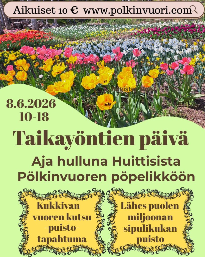 Maisematie Taikayöntie kulkee Urjalan ja Huittisten välillä. Lisäreitillä Puolimatka – Urjalan KK – Urjala as – Pölkinvuori – Hanhisuo – Nuutajärvi – Puolimatka saat luonnollisen lenkin reissusi päätteeksi tai aloitukseksi. Taikayöntien päivänä reitin varrella olevat matkailuyrittäjät järjestävät mielenkiintoisia tapahtumia. Meillä Kahvila Lasikiven taidenäyttely ja Kukkivan vuoren kutsu -puistotapahtuma, jossa puisto kukkii lähes 500 000 sipulikukan voimin. Kevään säät vaikuttavat kukinnan ajoitukseen.